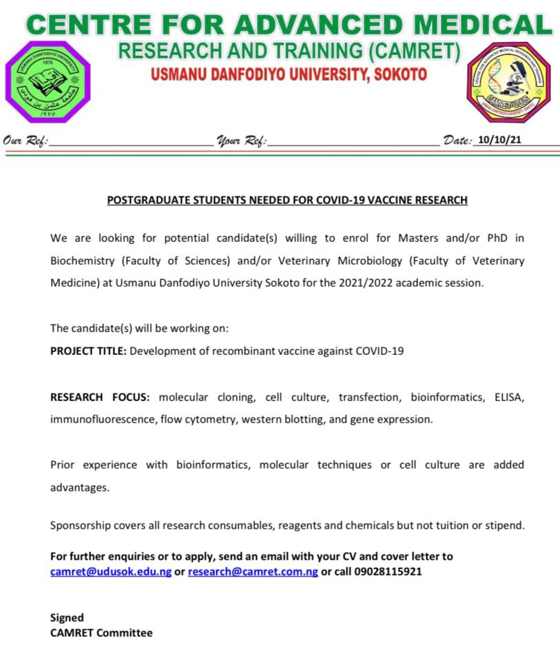 We are looking for potential candidates to willing to enroll for a Ph.D in Biochemistry (Faculty of sciences) and/or Vetrinary Microblogy (Faculty of Vetrinary Medicine) at Usmanu Danfodiyo Univers....