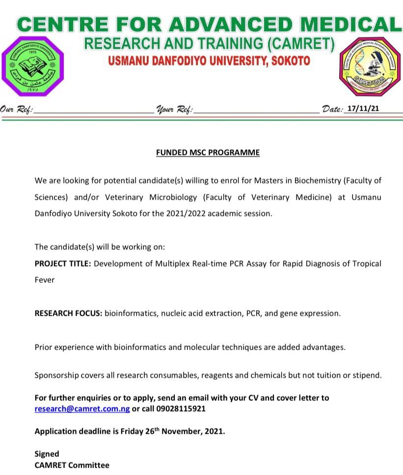 We are looking for potential candidate(s) willing to enroll for M.Sc. and/or Ph.D. in Biochemistry (Faculty of Chemical and Life Sciences) at Usmanu Danfodiyo University Sokoto for the 2022/2023 ac....